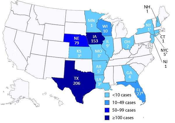 A total of 514 cases of Cyclospora infection have been reported from 17 states and 1 city. The number of cases identified in each area is as follows: Texas (206), Iowa (153), Nebraska (79), Florida (27)¶, Wisconsin (10), Illinois (9)†, Arkansas (5)†, New York City (5)†, Georgia (4), Missouri (3)†, Kansas (3)‡, Louisiana (3)‡, New Jersey (1), Ohio (2), Connecticut (1), Minnesota (1), New Hampshire (1), and New York (1)†.