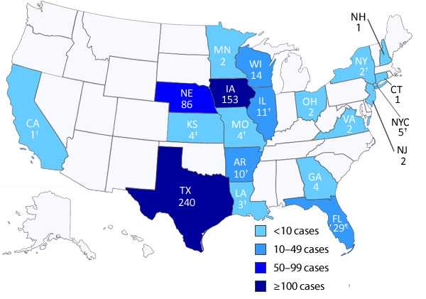 A total of 535 cases of Cyclospora infection have been reported from 18 states and 1 city. The number of cases identified in each area is as follows: Texas (215), Iowa (153), Nebraska (86), Florida (27)¶, Wisconsin (10), Illinois (9)†, Arkansas (5)†, New York City (5)†, Georgia (5), Missouri (4)†, Kansas (3)‡, Louisiana (3)‡, New Jersey (2), Ohio (2), Virginia (2), Connecticut (1), Minnesota (1), New Hampshire (1), and New York (1)†.
