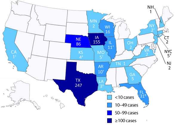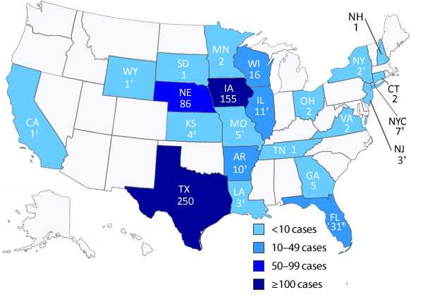 * Data are current as of 5pm EDT, 8/20/13. Data are preliminary and subject to change. A total of 598 cases of Cyclospora infection have been reported from 22 states and New York City. The number of cases identified in each area is as follows: Texas (250), Iowa (155), Nebraska (86), Florida (31)¶, Wisconsin (16), Illinois (11)†, Arkansas (10)†, Georgia (5), Missouri (5)†, New York City (5)†, Kansas (4)‡, Louisiana (3)‡, Connecticut (2), Minnesota (2), New Jersey (2), New York (2)†, Ohio (2), Virginia (2), California (1)†, New Hampshire (1), South Dakota (1), Tennessee (1), and Wyoming (1)†.