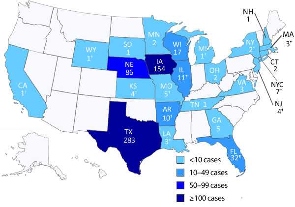 * Data are current as of 5pm EDT, 9/6/13. Data are preliminary and subject to change. A total of 646 cases of Cyclospora infection have been reported from 24 states and New York City. The number of cases identified in each area is as follows: Texas (283), Iowa (154), Nebraska (86), Florida (32)¶, Wisconsin (17), Arkansas (12)†, Illinois (12)†, New York City (7)†, Georgia (5), Missouri (5)†, Kansas (4)‡, New Jersey (4)†, Louisiana (3)‡, Massachusetts (3)†, Minnesota (3), Ohio (3), Virginia (3), Connecticut (2), New York (2)†, California (1)†, Michigan (1)†, New Hampshire (1), South Dakota (1), Tennessee (1), and Wyoming (1).
