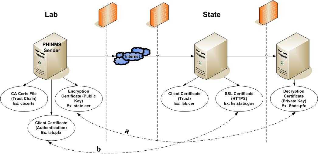 Certificate Authority Certificates: A Certificate Authority (CA) Certificate is a Key Store which comes bundled with the PHIN MS product. When a Sender is trying to make a HTTPS SSL (Secure Socket Layer) connection to the Receiver's IIS server, it needs to validate the certificate chain of the SSL certificate installed on the IIS server. PHIN MS uses this key store to look up for trust chain. When the Root and Intermediate Certificate of the SSL certificate are not present in the CA cert file then the HTTPS connection fails. The Receiver will need to provide the Root and Intermediate of the SSL certificate to the Sender in an email. The Sender will then need to import the information.