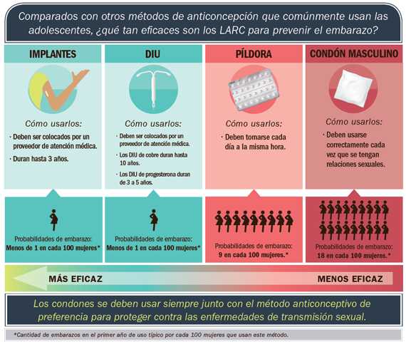 Tener bebés en la adolescencia puede implicar costos de salud, así como económicos y sociales para las madres y sus hijos. En los Estados Unidos ha descendido la tasa de nacimientos en adolescentes, sin embargo, en el 2013 nacieron más de 273 000 bebés de madres adolescentes de 15 a 19 años. La buena noticia es que una mayor cantidad de adolescentes está esperando antes de tener relaciones sexuales, y entre aquellas que son sexualmente activas, cerca del 90 % usó anticonceptivos la última vez que tuvo relaciones sexuales. Sin embargo, las adolescentes usan con más frecuencia condones y píldoras anticonceptivas, que cuando no se usan de manera sistemática y correcta, son menos eficaces para prevenir embarazos. Los dispositivos intrauterinos (DIU) y los implantes, que se conocen como anticonceptivos reversibles de larga duración (LARC, por sus siglas en inglés), son los tipos de anticonceptivos más eficaces en adolescentes. El uso de los LARC es seguro, no requiere que se tome una píldora cada día ni que se haga algo antes de cada relación sexual y, según el método que se use, puede prevenir el embarazo durante 3 a 10 años. Menos del 1 % de las mujeres que usan LARC quedan embarazadas dentro del primer año de uso.