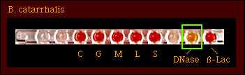 The DNase test distinguishes M. catarrhalis from all other gram-negative diplococci of human origin. Only N. ovis, a species isolated from sheep and cattle, produces DNase and fails to produce detectable acid from carbohydrates. It should be noted that strains of N. ovis have occasionally been isolated from humans. The colonies of N. ovis are translucent and butyrous compared with those of M. catarrhalis which are opaque and usually friable.